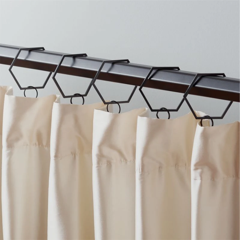 Set of nine matte black drapery rings hang curtains in geometric form. An edgy complement to the Bolt curtain collection designed by Sasha Adler.