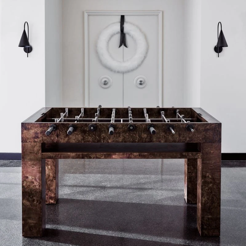 Designed by Barcelona-based Mermelada Estudio, rich burl wood plays beautifully with stainless steel details in this statement foosball table. Polished and brushed miniature players stand in position on stainless steel rods, hovering above a matte black field with contrasting white lines. CB2 exclusive.