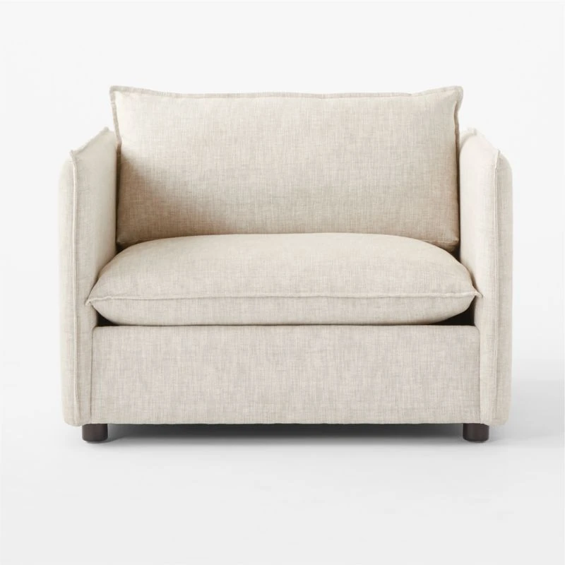 Built on a thin frame, Italian-inspired chair and a half brings a sense of lightness despite its oversized proportions. Transitioning easily between formal and informal settings, the chair’s clean lines and slim silhouette offer a modern aesthetic, while flange-trimmed linen upholstery in a tonal neutral nods to more traditional influences. Seamless armrests and super-soft loose cushions make it a perfect spot to curl up. CB2 exclusive.