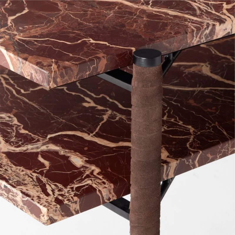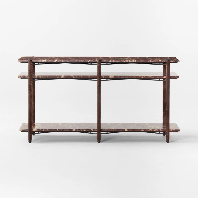 Console table by VUUE marries opulence with exacting craftsmanship. Shelves crafted from polished Rosso Levanto marble are awash in rich hues of brown, red and cream. A steel frame, lustrous in black powder coating, is wrapped in rich, chocolatey suede to create an indulgent and dramatic entryway moment. CB2 exclusive.