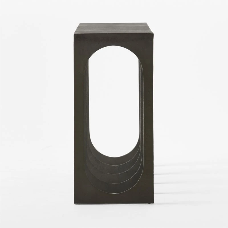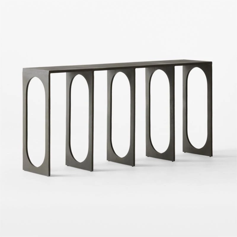 Statement console table by Mermelada Estudio captures interest through silhouette and cast texture. Handcrafted design, the sand cast aluminum is coated with a matte gunmetal finish with tonal variation throughout. A simple tabletop rests on legs with repeating oval cutouts, making a compelling sight from any perspective. CB2 exclusive.