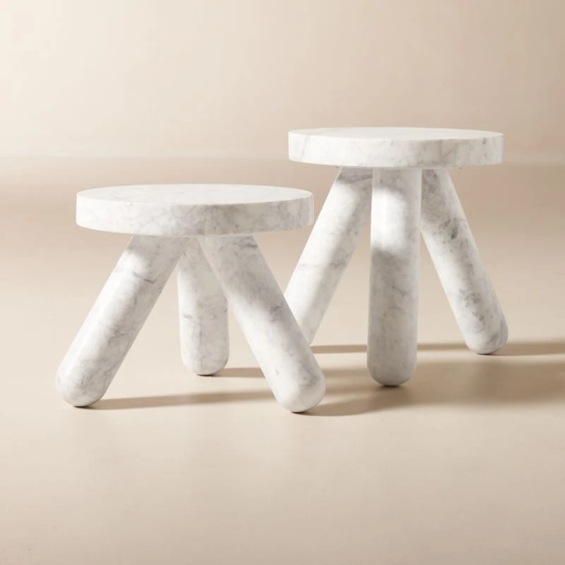 Designed by London-based Studio ANANSI, unexpected side table turns furniture into art. Subtle purple and soft grey veining waves across the white marble. Hand-finished with three rounded legs that look straight out of a modern art museum. CB2 exclusive.