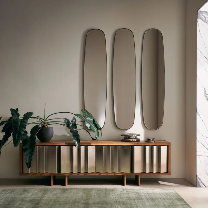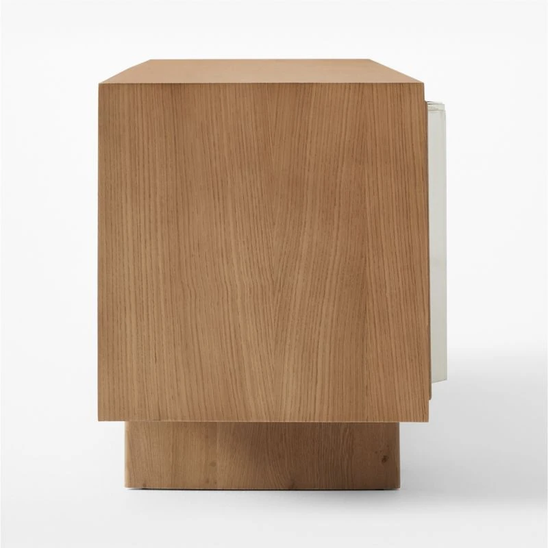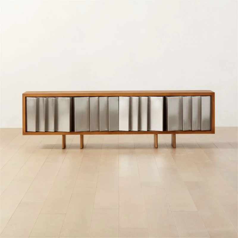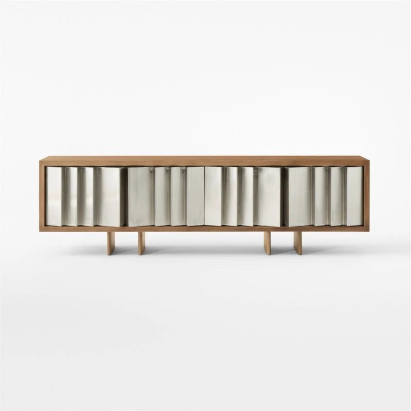 Kravitz Design combines metal and wood into a striking statement piece. Combining French industrial and Brutalist inspirations, elongated oak frame artfully contrasts with sculptural metal doors for a style both raw and refined. Inside offers ample storage and discreet cord cutouts. CB2 exclusive.