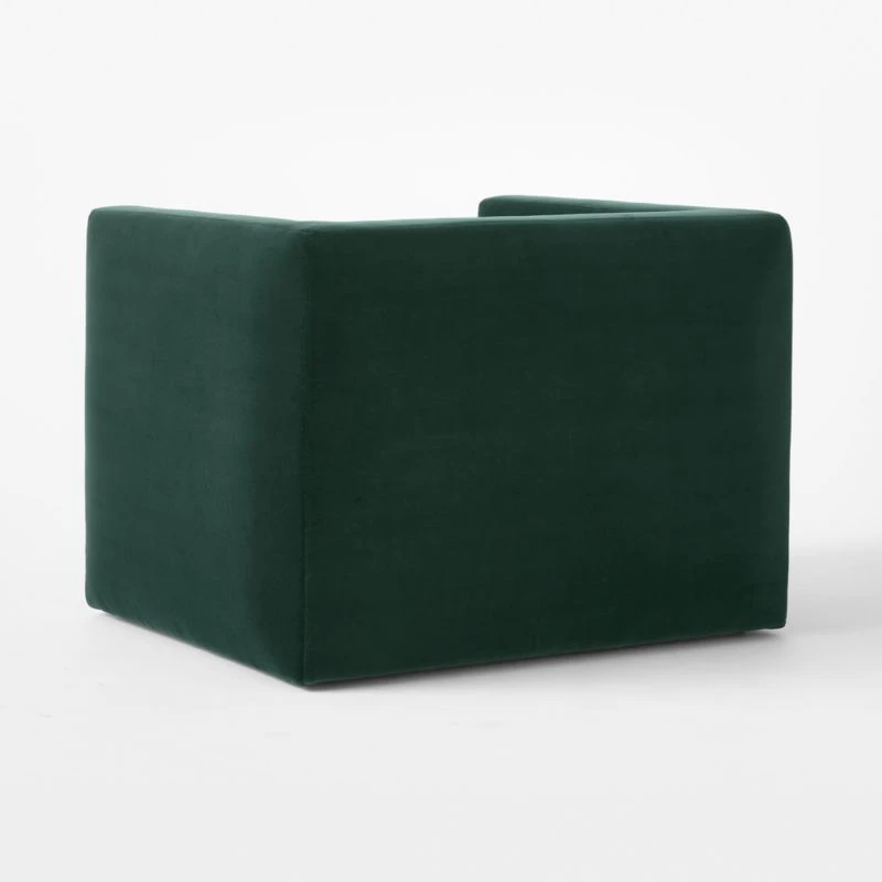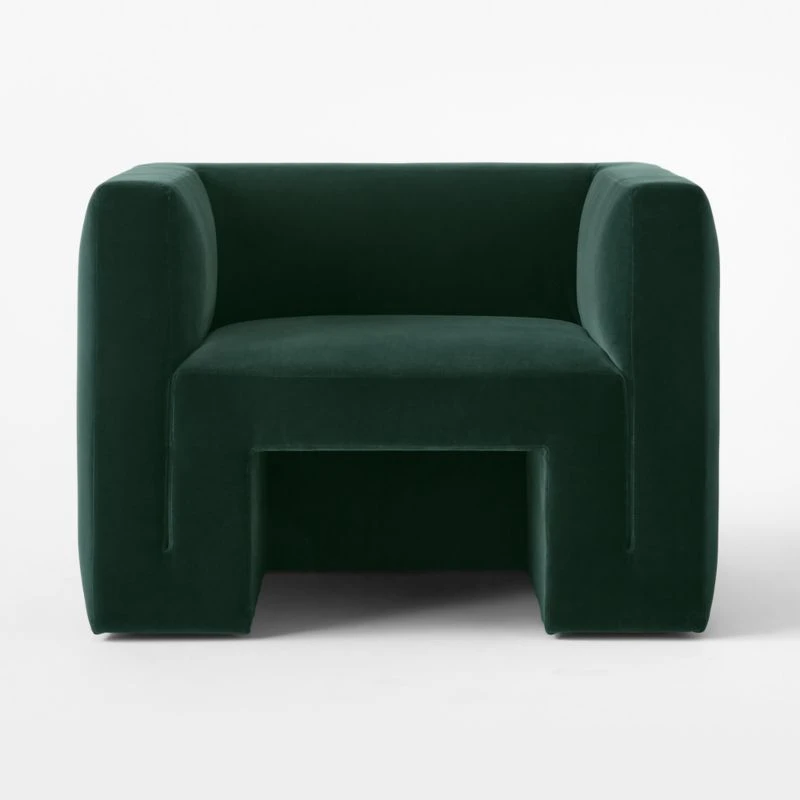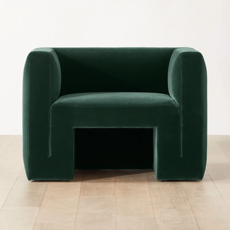 Simple yet bold lounge chair by Mermelada Estudio has an architecturally inspired aesthetic. Designed to look like a single piece that’s folded and manipulated, its rigid silhouette contrasts nicely with plush deep teal velvet upholstery. CB2 exclusive.
