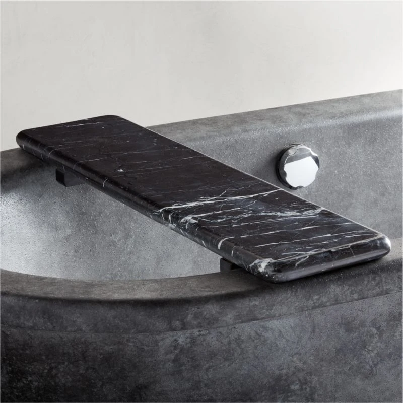Rich black Marquina marble bath caddy with striking white veining is a luxe addition to the bath. Each is handcrafted in India with a mango wood back that adjusts to fit securely on the tub. Unique color, tone and activity define the piece and instantly elevate your daily soak. Coordinate with the full black Marquina marble bath collection for an extra chic look. CB2 exclusive.