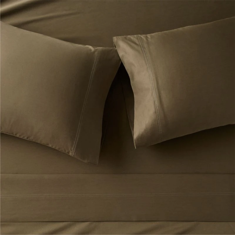 520-thread-count organic cotton sateen is a modern classic. Naturally wrinkle-free, the dark green bedding offers a super-soft hand with subtle luster. CB2 exclusive.
