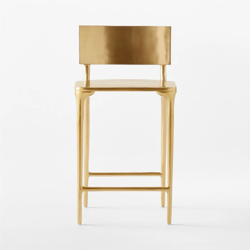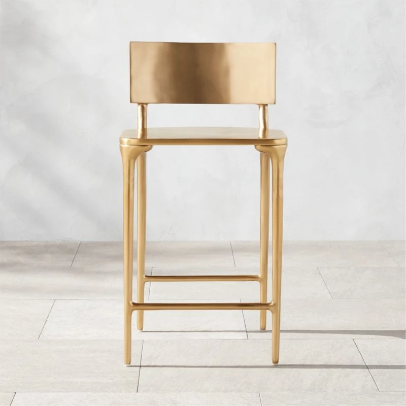 Gold finish bathes polished aluminum bar stool in warm luxury. Elegant seat shines at any outdoor dining or cocktail space. CB2 exclusive.