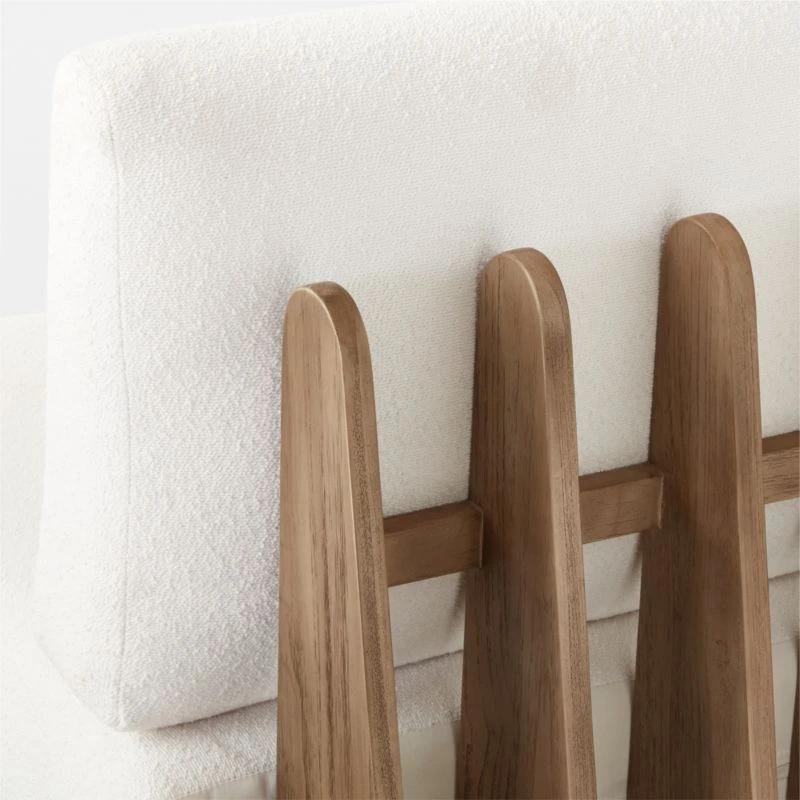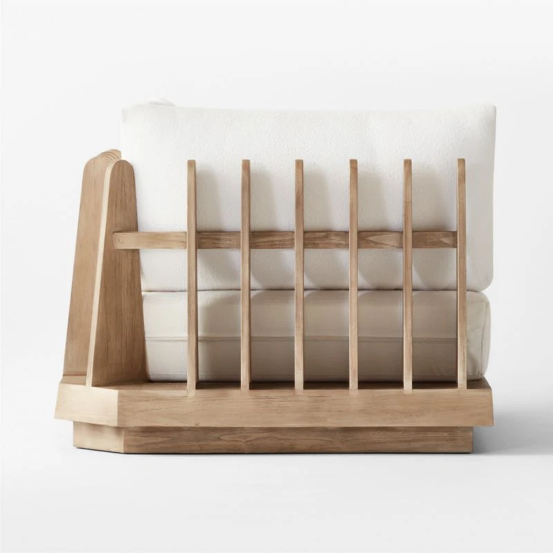 Generously proportioned, ultra comfy outdoor sectional by Jannis Ellenberger features an elevated mix of materials that turns ever-popular indoor boucle into an outdoor statement piece. Rich in natural oils, teak certified by the Forest Stewardship Council ® has an element of natural protection, making it an exceptional base for this chair. Plush, white Sunbrella ® boucle cushions play well with the teak, offering a nubby, textured feel that’s incredibly unique among outdoor fabrics. CB2 exclusive.